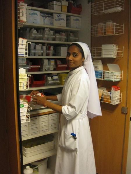 1) Schwestern bei ihrer Arbeit mit Patienten im kirchlichen Krankenhaus.
